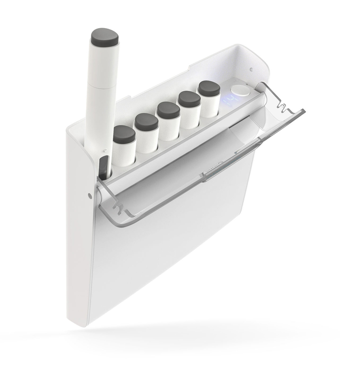 "PraluBase®"是一种新的、创新的预装药笔储存方案,适合放在冰箱里。通过使用磁铁和自粘性安装板,该产品无需工具即可安装。磁性安装系统允许用户方便地取出来进行清洁和重新填充。一个独特而隐蔽的定时器功能可以提醒病人14天的摄入间隔。集成的显示屏显示距离用药的剩余天数。透明盖子后面的传感器检测到冰箱门的打开,并发出声音信号,提醒病人哪天要吃药了"。
